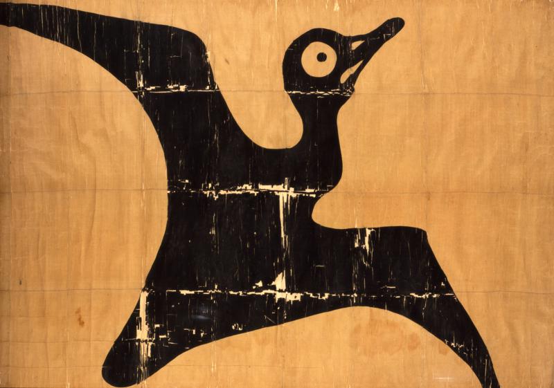 A Mogami family heirloom, this battle standard was said to have been captured as a war trophy when Mogami forces defeated the Uesugi Army during a battle of the Dewa Campaign at the entrance to Kaminoyama in the year 1600. This standard features the distinctly modern design of a single wild goose in flight upon a white background. In the Battle of Hasedō Standing Screen, a flag with a very similar design can be seen in the upper half of the sixth panel of the left-hand screen.(L)