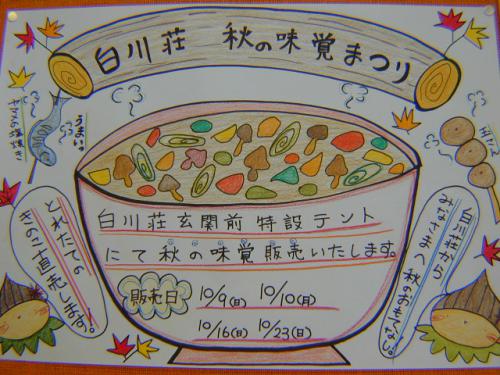10月16・23日、白川荘前にて行います。紅葉もその頃が旬。松茸ご飯・きのこ汁・塩焼きなど用意してお待ちしてます。今日も行ってますが出足少なめかな?