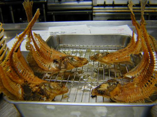 今夜はちょっとしたイベントが行われます。なんと女性のみによる獅子舞が行われるとか。厨房でお客様を待つカレイでした。