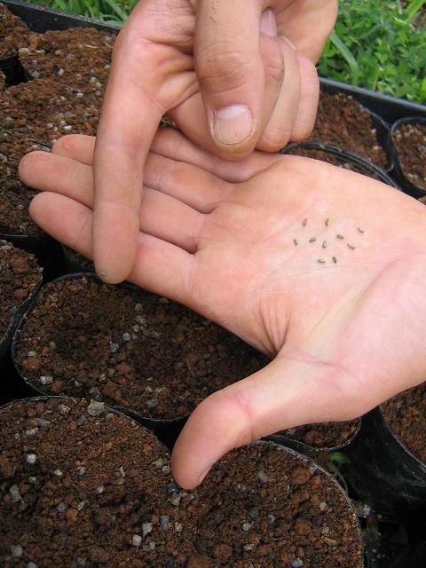 トレビスは育苗用ポットへ播種しました。ポットの底1cmに保水材を敷設しました。画像はトレビス播種風景です。