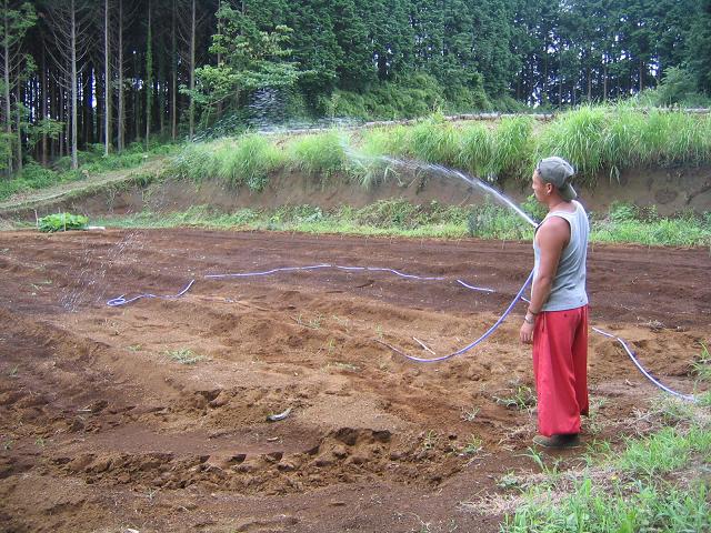 今日は害虫忌避の為、育苗用ポットの置いてあるD区、フダンソウ・春菊・ニンジンを播種したE区に『友農水』を散布しました。画像は散布風景です。