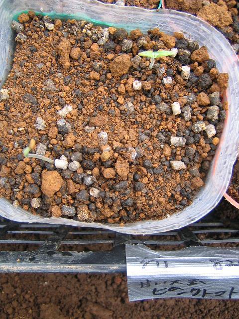 播種後4日目のトマトは10品種中4品種の、フルーツプチトマト・ミニミニオレンジトマト・ミニレモントマト・甘い大玉ピンクトマトの発芽を確認しました。