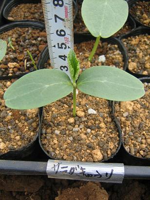 きゅうりは大分大きくなってきました。双葉がポットの横幅を越すほどです。