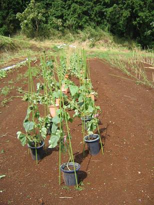 台風の影響、きゅうりは鉢へ定植したものがかなり倒されてしまいました。支柱ごと根が抜けてしまったものもあります。