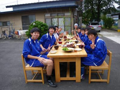 「そうだ!田舎に泊まろう!!」ということで 仙台市より宮城教育大付属中学の2年生がやってきました。 山形総合学習という名の教育旅行で、飯豊町(中津川)、白鷹町(中山)、 高畠町、そして長井の伊佐沢へ、計159名の生徒さんを受け入れ、 伊佐沢には30名の生徒さんが。 当方は6名の男子生徒を受け入れ、いろいろお手伝いをして頂きました。 黒小豆の収穫。 そのまま脱穀。 お外でランチ。 おにぎり、味噌汁、玉子焼き、鳥のから揚げ、ふかしさつま芋。 みんなもりもり食べて気持ちがよい。 午後は田んぼへ。 コシヒカリの田んぼの稗抜き作業。 さすがに6人もいると早いこと早いこと。 途中からトンボ取り大会になり盛り上がりました。 不要になった竹を軽トラに積み込み。 軽トラ荷台に乗ってのドライブはどこの子でもテンション上がります。 夜は蕎麦屋で芋煮だごで。親方一家もご一緒に 秘伝の枝豆、じゃがいも炒め、菊とほうれん草のお浸し、おにぎり3種と、 どれもこれも伊佐沢尽くしで大好評! みんな元気がよく、礼儀も良く、働いてくれました。 ありがたやありがたや。 |