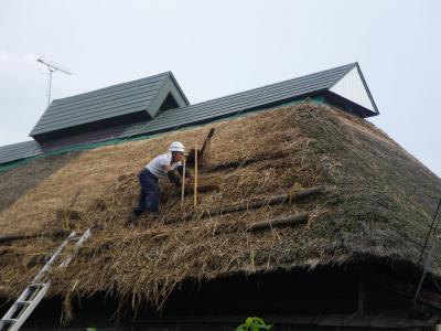 車で走っていたら萱葺き屋根の葺き替えに遭遇し、思わずパシャリ。