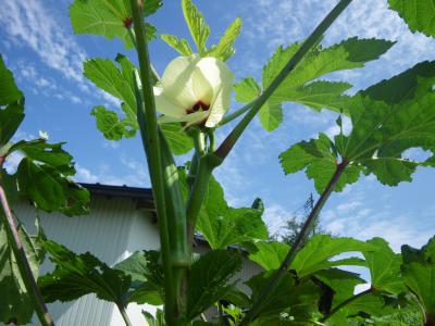 オクラの白い花が青空に映えます。