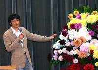 9月8日、川西町中央公民館を会場に「やまがた花回廊フォーラム」が開催され、NHK趣味の園芸講師の田中哲(あきら)さんが、「庭先からの花回廊づくり」と題し講演を行いました。 日本のオープンガーデンの草分け「小布施」の事例を、画像を使い詳しく解説頂くと共に花いっぱいの街づくりについて提言されました。特に、ヨーロッパ風の庭作り(ガーデニング)にこだわらず、山形の自然・風土に合った植生を選定しながら、また、人に見せる庭造りではなく、自らの楽しみとしての花壇作りを心がけるよう、楽しく話されました。 講演の後で、近隣市町で花つくりを実践している方々の事例発表会も行われ、花作りへの情熱がふつふつと湧き上がる感覚になりました。 写真は、ダリアに語りかけるように講演される田中先生 |