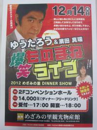 12月14日に『2012 めざみの里ディナーショー』を開催します!! 今回はものまねタレントゆうたろう、前田敦子のそっくりさん濱田真瑞をお迎えして爆笑ものまねライブをおこないます!! [時間]受付17:00、開宴18:00 [チケット]税込14,000円 (ディナー・フリードリンク) [場所]道の駅いいで めざみの里観光物産館 2Fコンベンションホール 楽しい催し物とおいしいお料理をご用意してお待ちしております。 お楽しみ抽選会もありますので、皆様ぜひお越し下さいませ!! 詳しくは、めざみの里観光物産館0238−86−3939まで お問い合わせください。 |