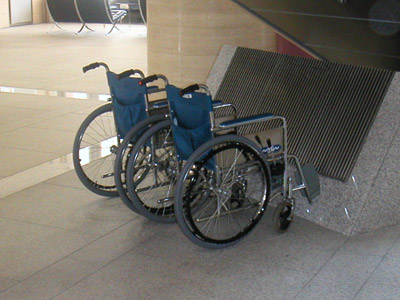入り口には、車いすも完備されており足の不自由な方にもやさしい図書館となっています。 全フロアー段差のない造りになっています。もちろん、エレベーターもあります。