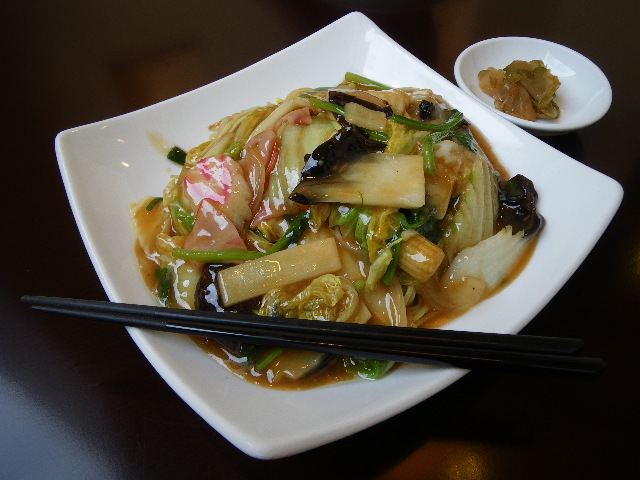 お好みでお酢をかけて頂きます。 堅めに焼いた中華麺とあんかけのコンビネーション。