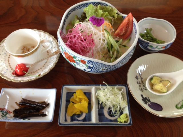 お蕎麦の他に、天ぷら/サラダ/つけもの/おかず4品/おしるこが付きます。