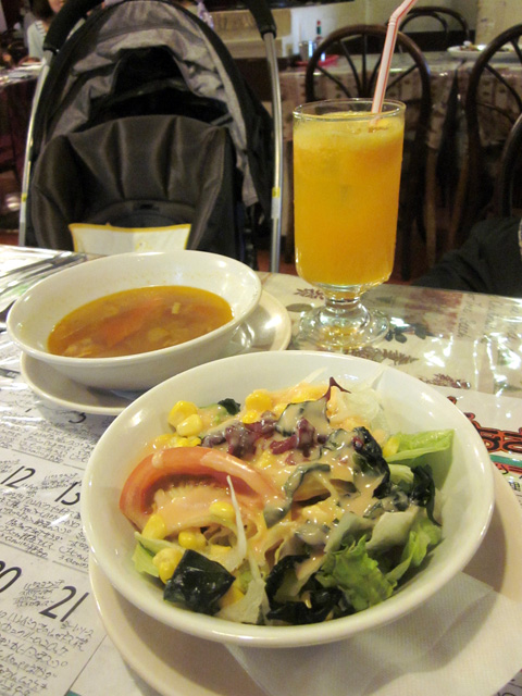 Aセットは以下の通り。 ・グラスビールorワインorオレンジジュース ・本日のスープ ・サラダ ・デザート ・コーヒー(HOT or ICE)