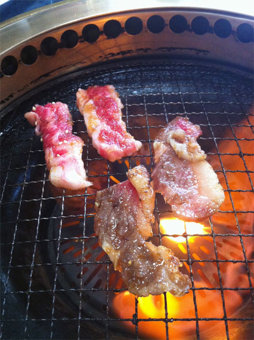 厚切りのカルビを遠赤外線のガスコンロで焼きます。